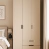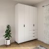 ארון מעוצב בקווים מודרניים בעל דלתות פתיחה, עשוי ממלמין יצוק 17מ"מ, בעל מבנה חזק במיוחד, מתאים לחדרי שינה, חדרי ילדים, חדרי משחקים, מצוין לאחסון יעיל, כולל יחידת כוורת פתוחה, בעובי משודרג 28ממ, המתאימה לאחסון דקורטיבי, ולהנחת דברי נוי, ספרים, משחקים, וכ"ו. הארון משולב וכולל שולחן כתיבה מלמין 28ממ "היוצא" מתוך הארון ויוצר ניצול פינתי של ארון אחסון ושולחן פינתי. צבע השולחן שייבחר יהיה גם צבע הקוביות הפתוחות. לארון סידור פנימי כולל מדפים ותליה לפי סקיצה מצורפת. הארון נפתח באמצעות ידיות רוכבות שחורות – למראה חלק וללא ידיות.